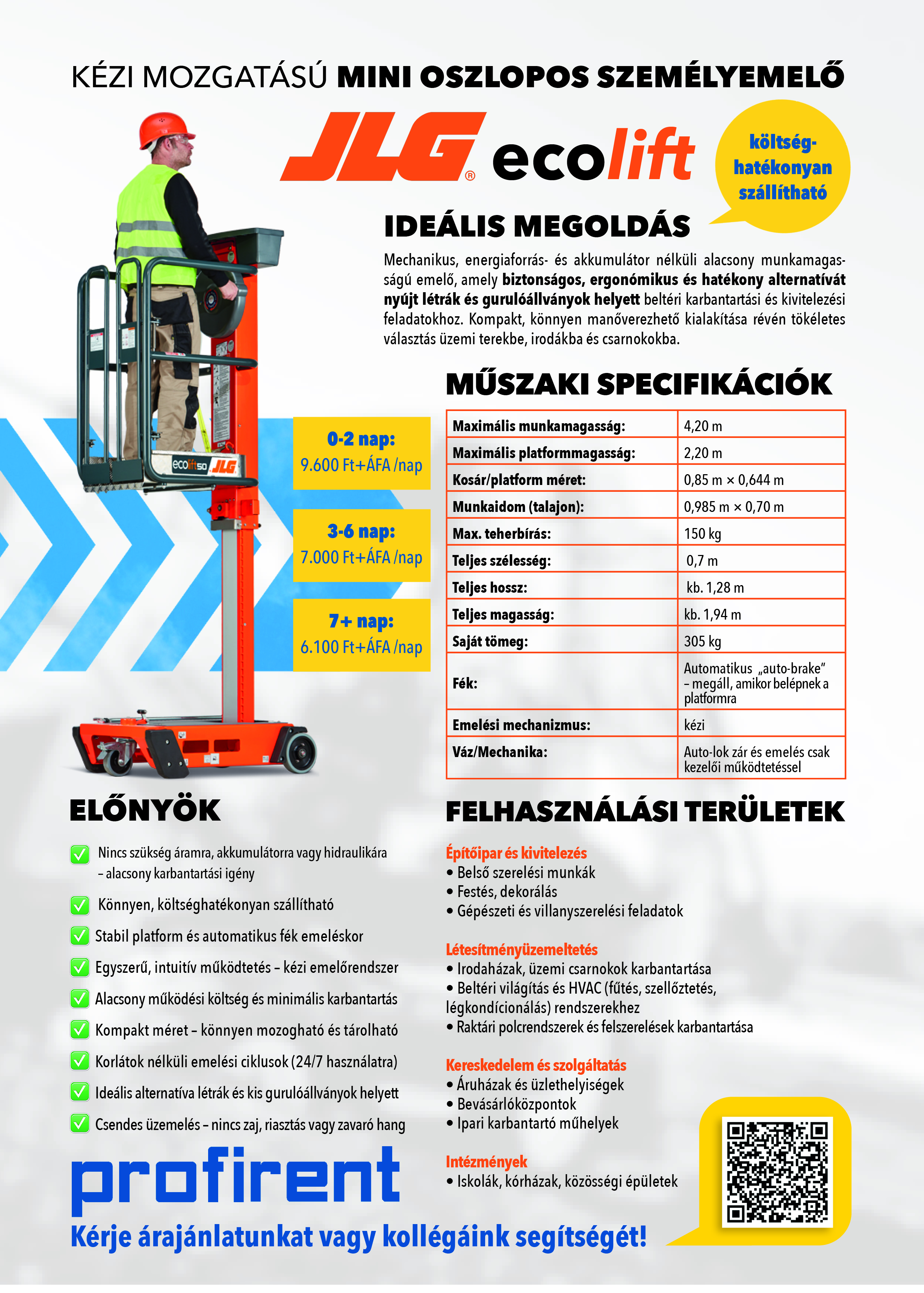 Szakmai ismerettel rendelkező kollégák állnak ügyfeleink rendelkezésére, műszaki kérdéseik megválaszolásában, illetve segítenek kiválasztani a legmegfelelőbb emelőgépet az adott munkához.